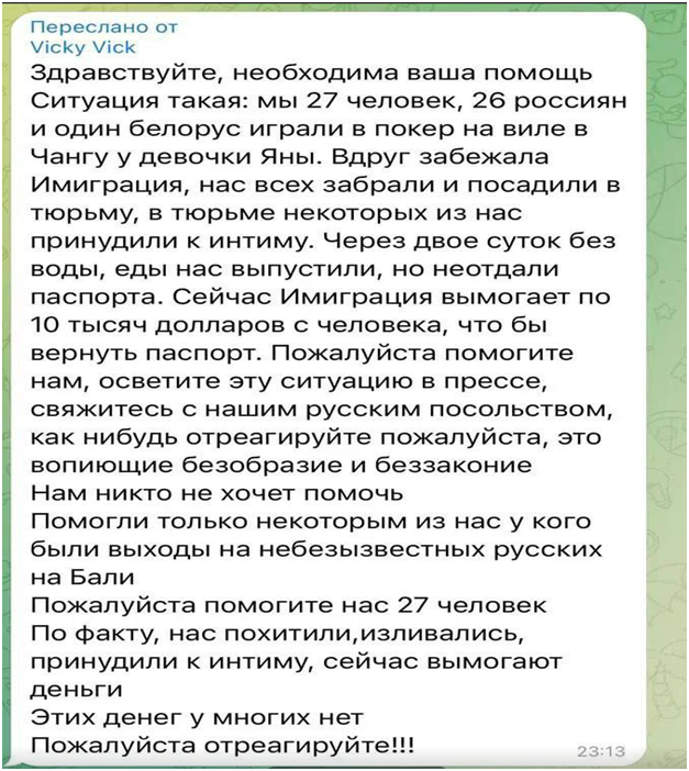 В телеграм-каналах появилась информация, что задержанные попросили знакомых связаться с российским посольством в Индонезии. Они пожаловались на жестокое обращение и издевательства со стороны миграционной службы. «В тюрьме некоторых из нас принудили к интиму», – написал один из них.