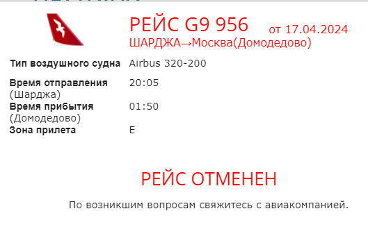 В Москве рейс G9 956 должен был приземлиться в 01:50 17 апреля. Сейчас на онлайн-табло аэропорта Домодедово он значится как отмененный. Задержка составляет уже более 14 часов.