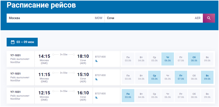 Как убедился корреспондент TourDom.ru, по данным расписания, авиакомпания NordStar выполняет рейсы из Москвы в Сочи с периодичностью 7 раз в неделю. Однако среди слотов нет времени вылета 07:50 – самолеты отправляются из Домодедово в 11:15, 12:15 или в 14:15.